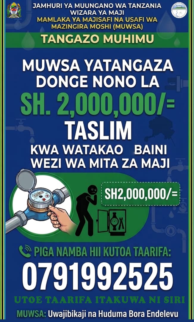 Mamlaka ya Majisafi na Usafi wa Mazingira Moshi imetangaza dau nono la Tshs: milioni mbili (2,000,000) kwa mwananchi yeyote atakayeleta taarifa za kuthibitika za wananchi wasio waaminifu wanaohujumu miundombinu ya maji kwenye maeneo ya Mamlaka.